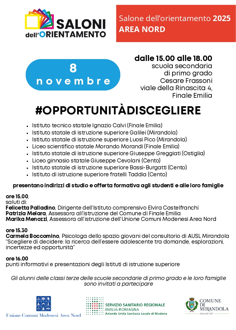 L’8 novembre, dalle 15.00 alle 18.00, presso la Scuola Secondaria di Primo Grado “Cesare Frassoni” (Viale della Rinascita 4, Finale Emilia), si terrà un importante incontro dedicato all’orientamento degli studenti di terza media e delle loro famiglie.